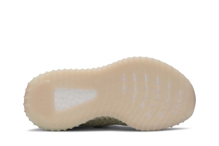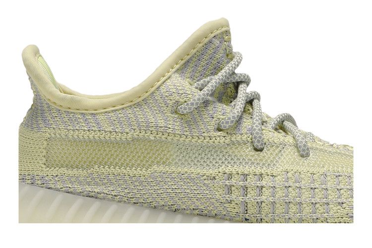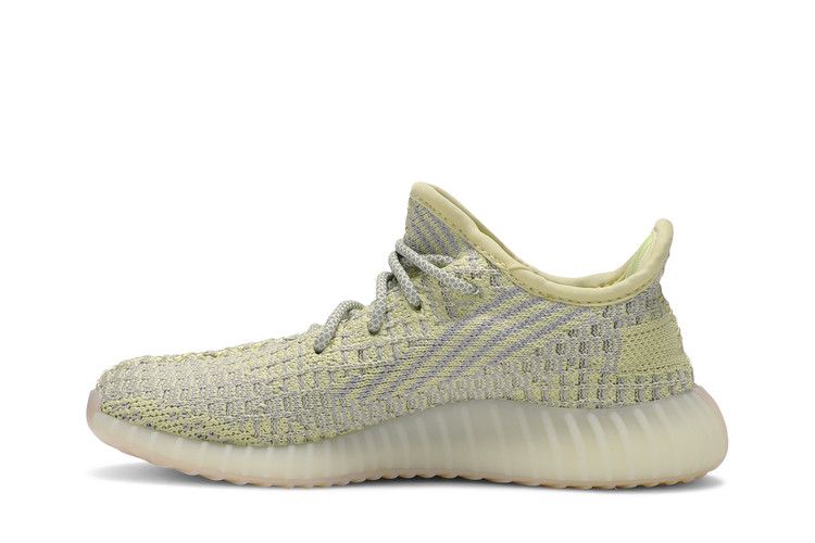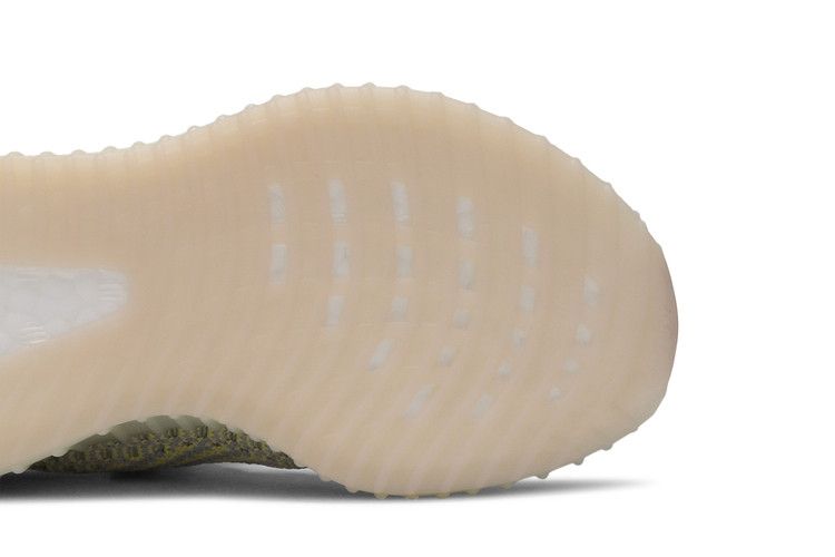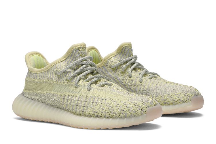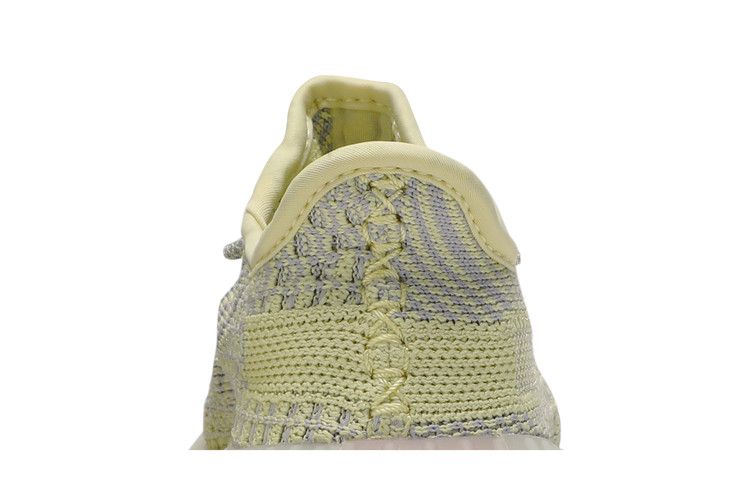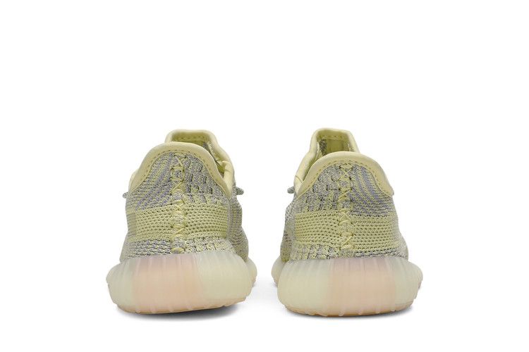 The adidas Yeezy Boost 350 V2 Antlia (Kids) features a muted yellow-green Primeknit upper with gray hues, inspired by the Antlia galaxy. The design includes a semi-translucent lateral stripe and fluorescent details. Boost technology in the midsole ensures cushioning, while the rubber outsole with herringbone tread provides traction. The upper incorporates reflective laces and a two-toned woven construction.
