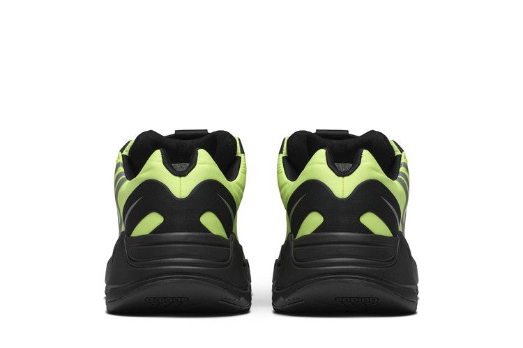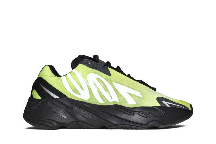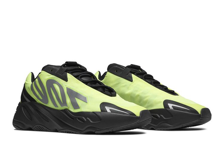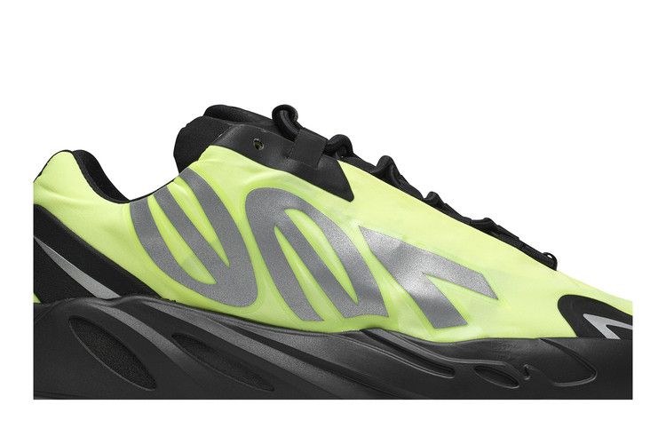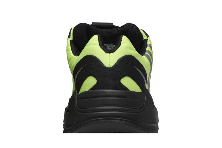 The adidas Yeezy Boost 700 MNVN Phosphor features a neon yellow mesh upper with black pull tabs and toe. The laceless design includes a black sock liner, tongue, and overlay...