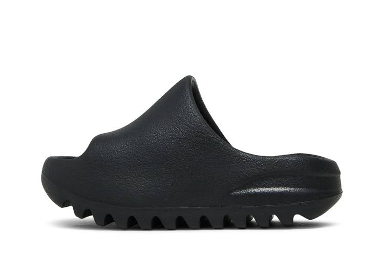 The adidas Yeezy Slide Kids ‘Onyx’ is a slip-on sandal featuring a one-note finish with a lightweight and durable injected EVA foam build. The open-toe design offers improved airflow, and the footbed includes a soft top layer for comfort, adorned with a debossed adidas logo. The serrated outsole provides traction and flexibility for a comfortable stride. The sandal is completed with a rubberized foam construction and Adidas' three-stripe logo on the footbed.