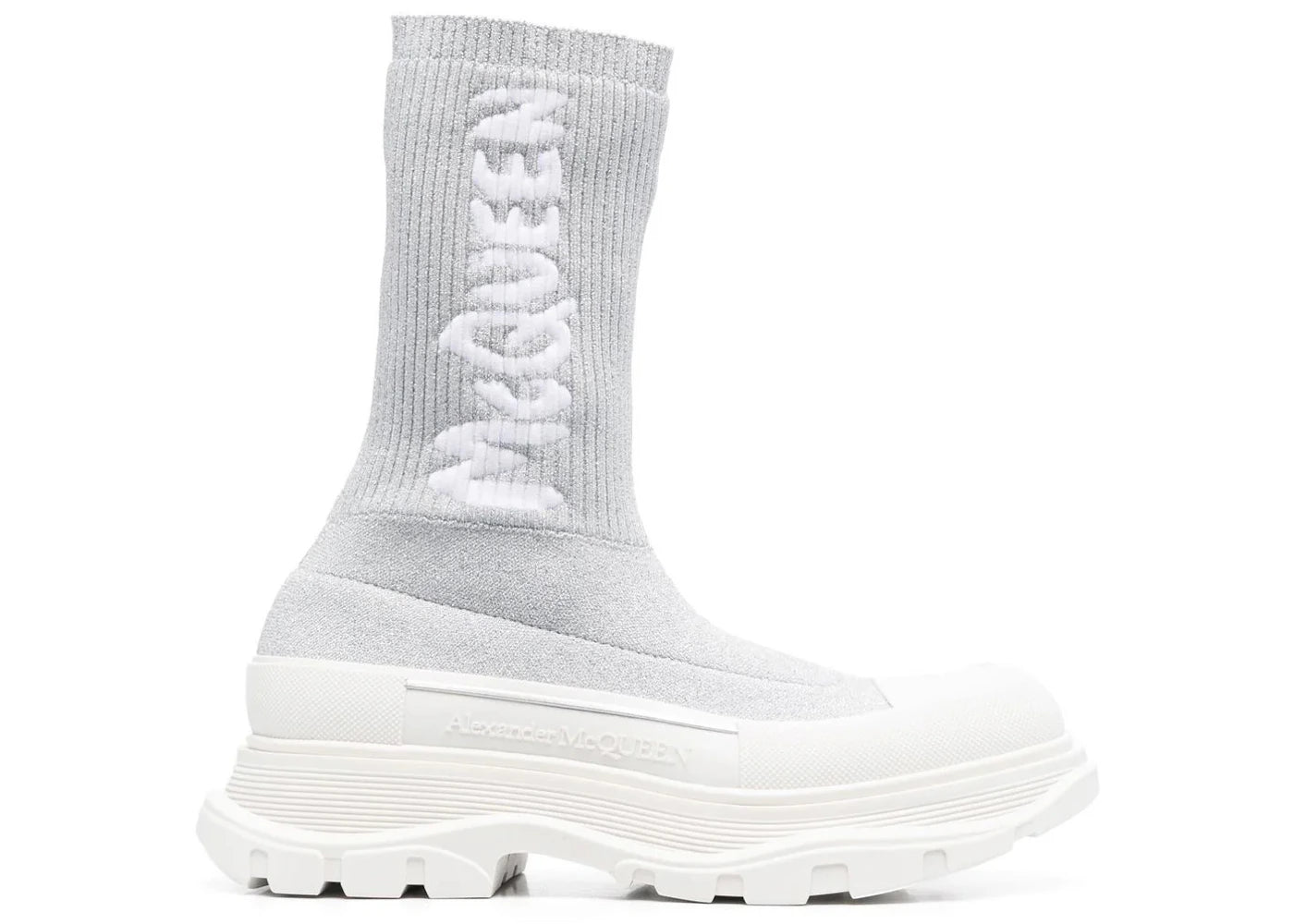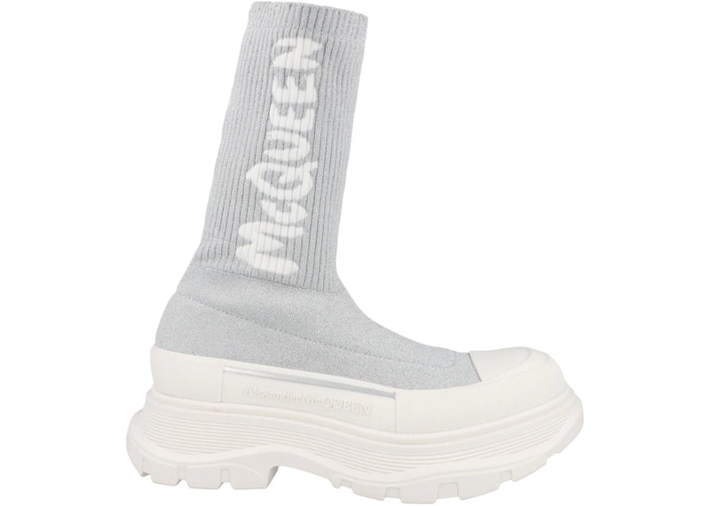 The Alexander McQueen Logo Intarsia Chunky Sock Sneaker Grey White (Women's) is now available at Side Kicks!
