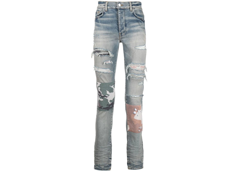 The AMIRI Distressed Camoflage Slim-Fit Jeans Blue is now available at Side Kicks!