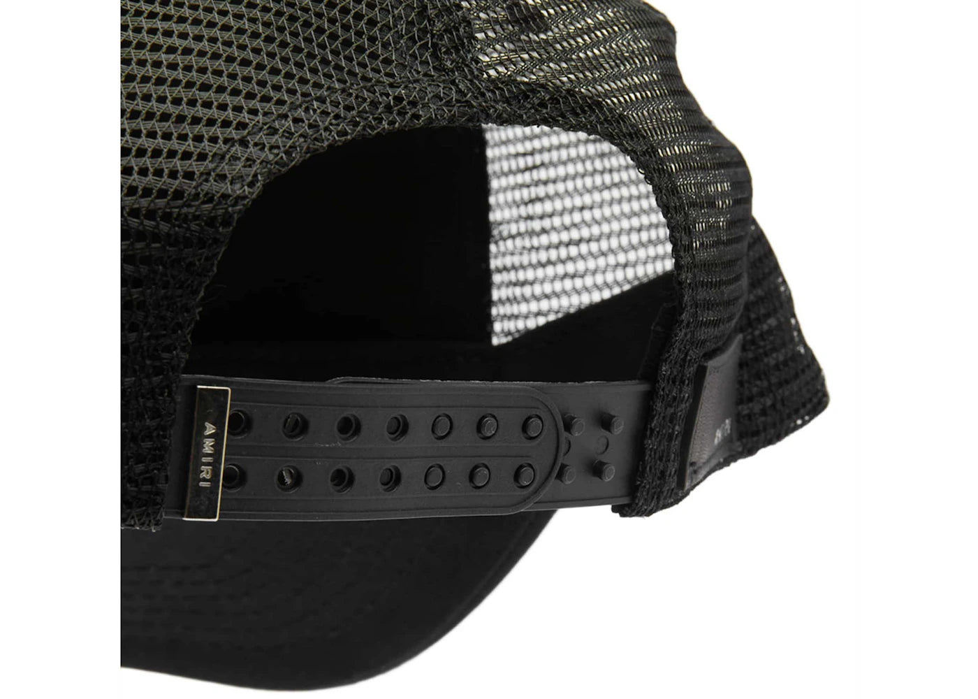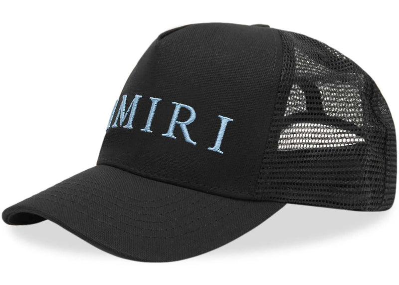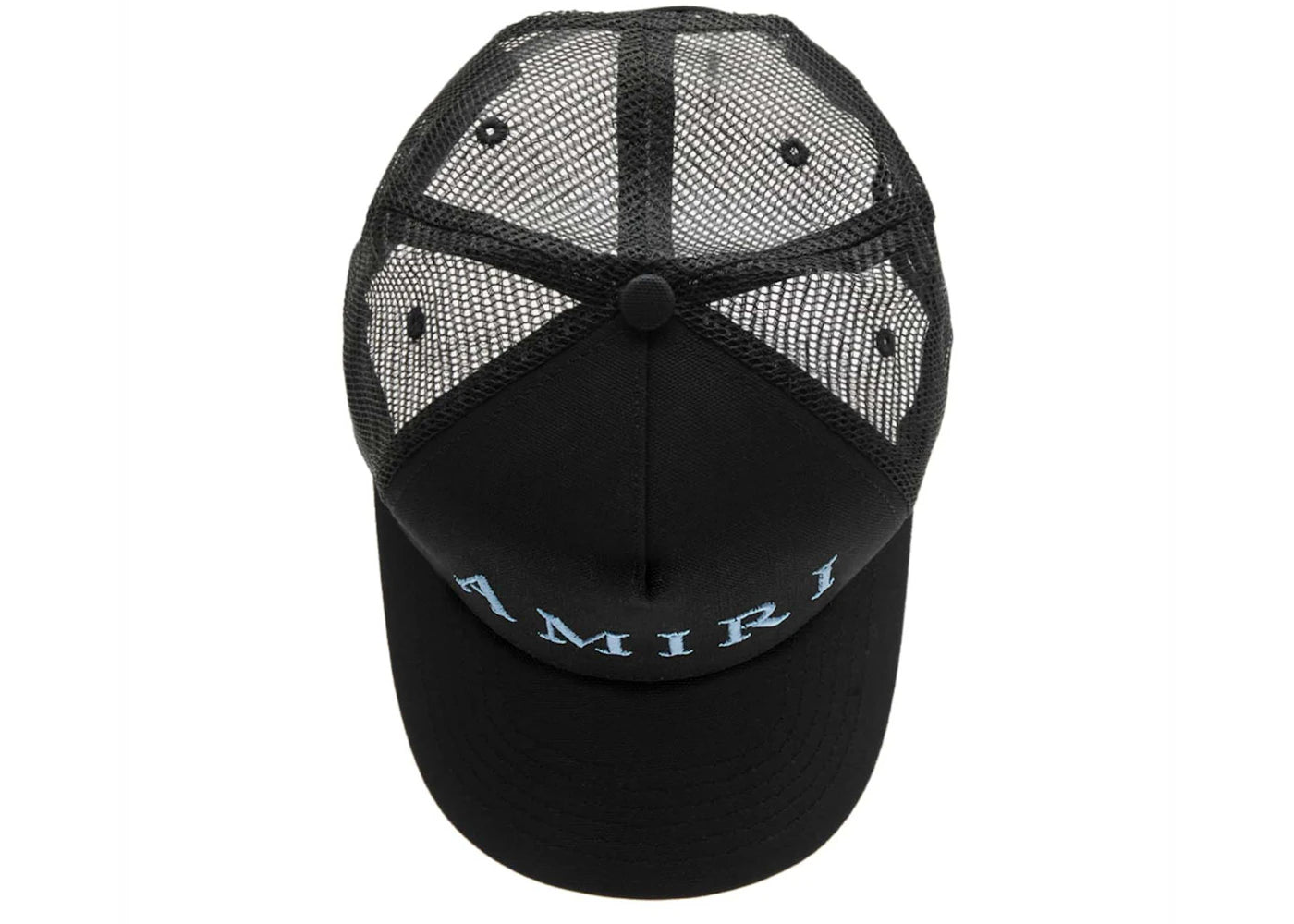 The AMIRI Embroidered Logo Trucker Cap Black/Carolina Blue is now available at Side Kicks!