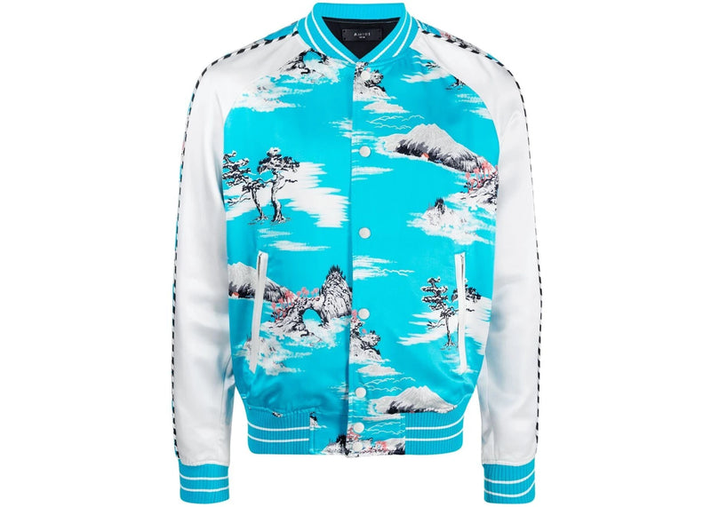 The AMIRI Hawaiian Print Bomber Jacket Cyan Blue is now available at Side Kicks!