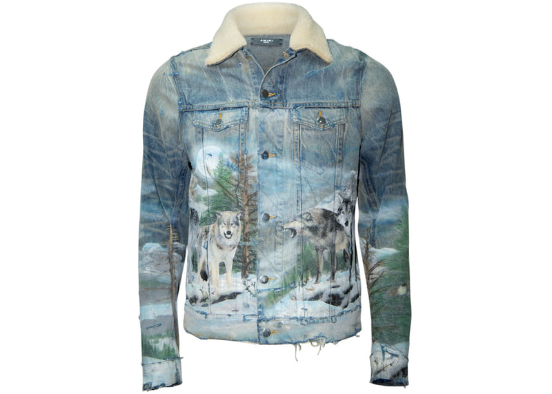 The AMIRI Sherling Airbrush Wolf Denim Trucker Jacket Blue is now available at Side Kicks!