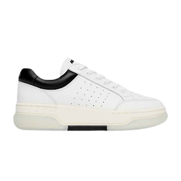 The AMIRI Stadium Low features a low-cut design with a black full-grain calf leather upper. Perforations enhance breathability, while a thick white midsole and translucent outsole provide support. The padded ankle adds comfort for everyday wear.