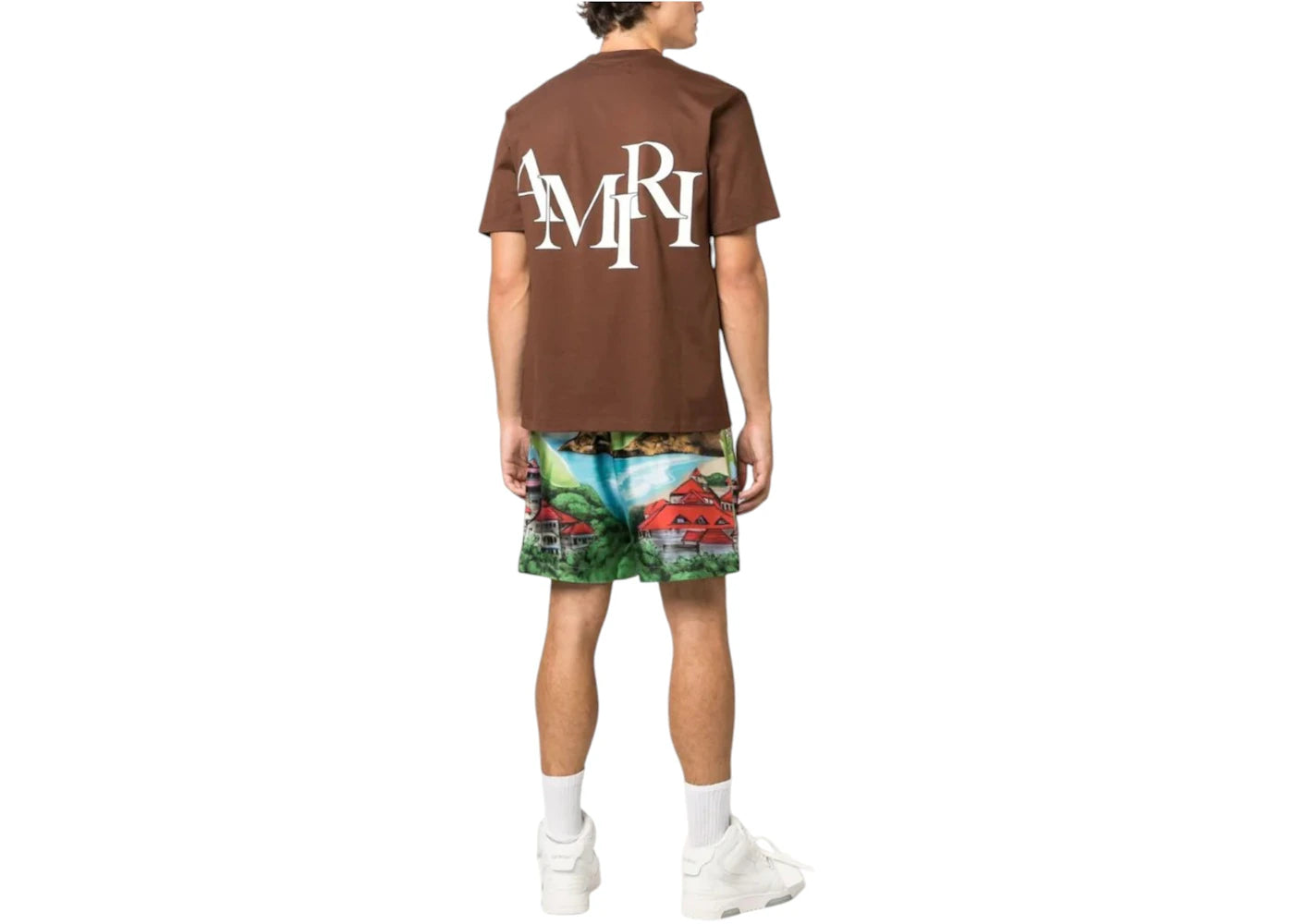 The AMIRI Staggered Logo Tee Potting Brown is now available at Side Kicks!