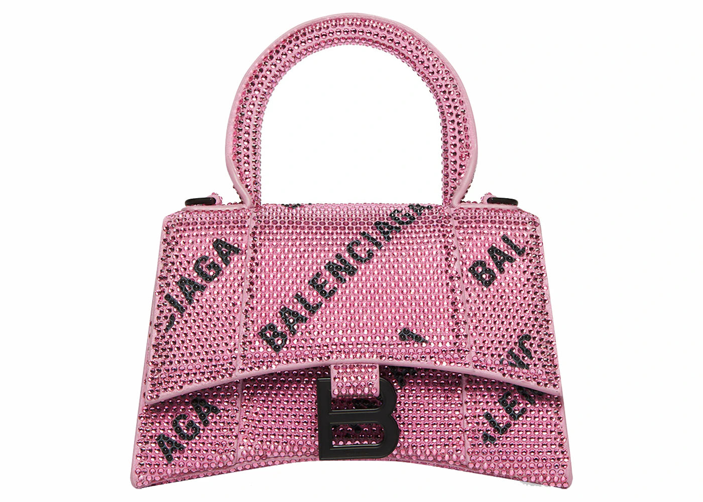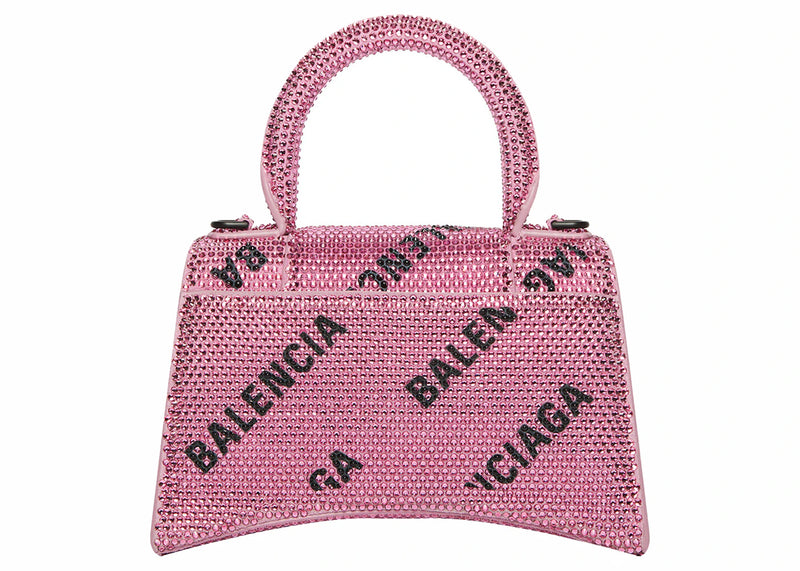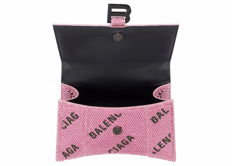 Balenciaga Hourglass XS Handbag With Chain and Allover Logo Rhinestones Pink/Black