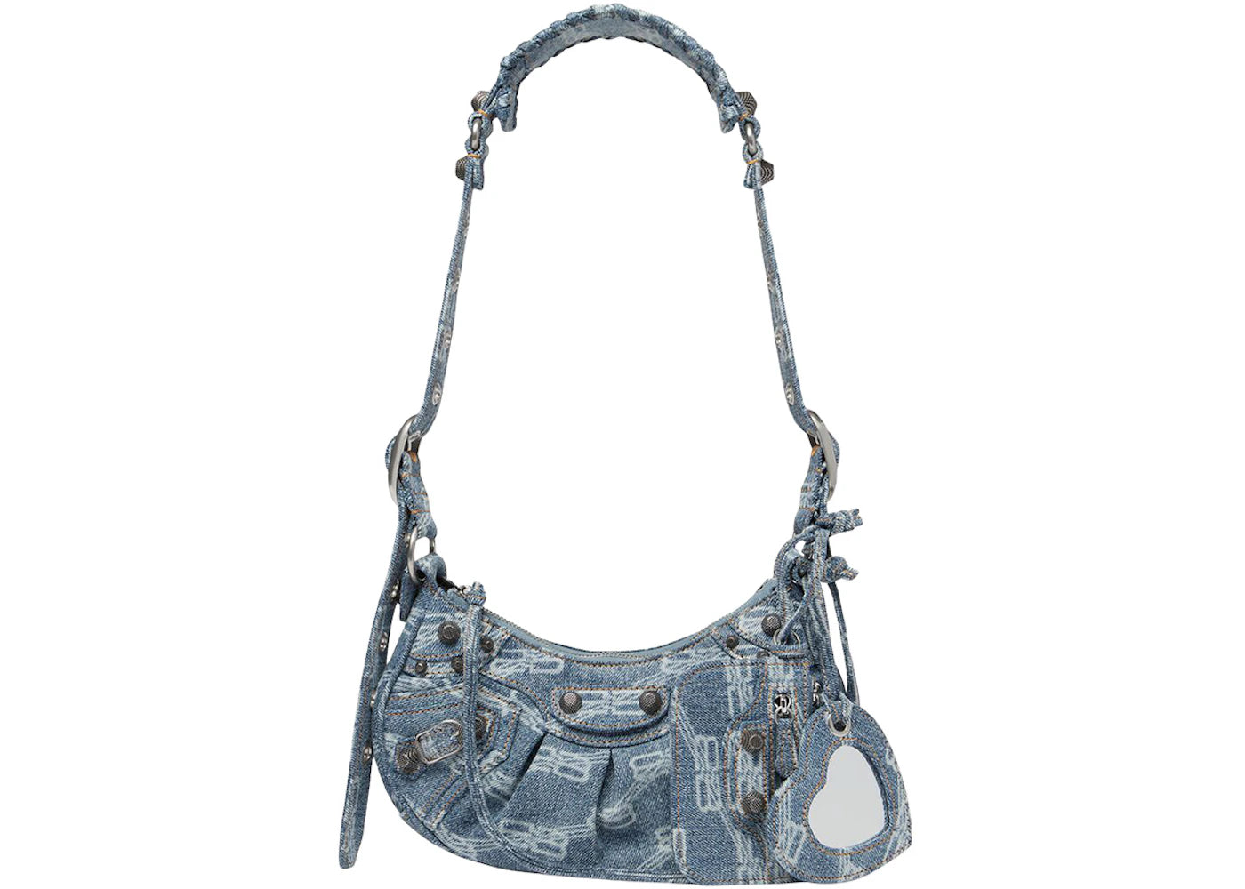 The Balenciaga Le Cagole Shoulder Bag XS BB Monogram Blue/Bleached Denim is now available at Side Kicks!