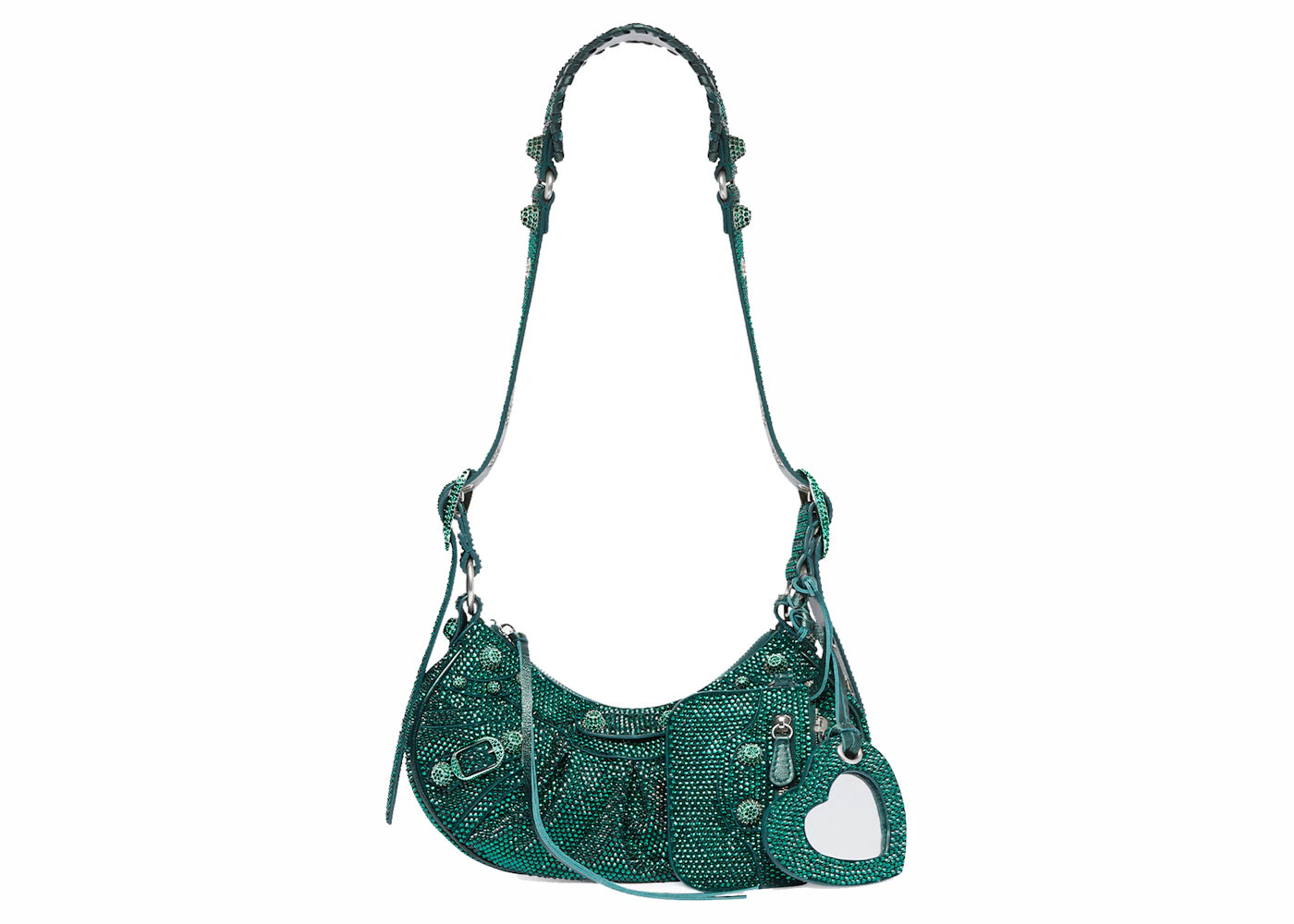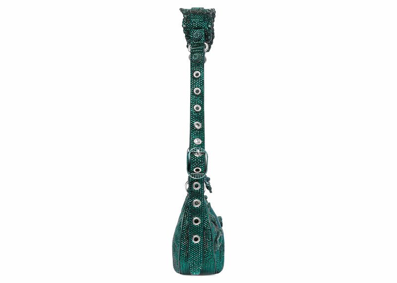 The Balenciaga Le Cagole Shoulder Bag XS Green Suede with Rhinestones is now available at Side Kicks!