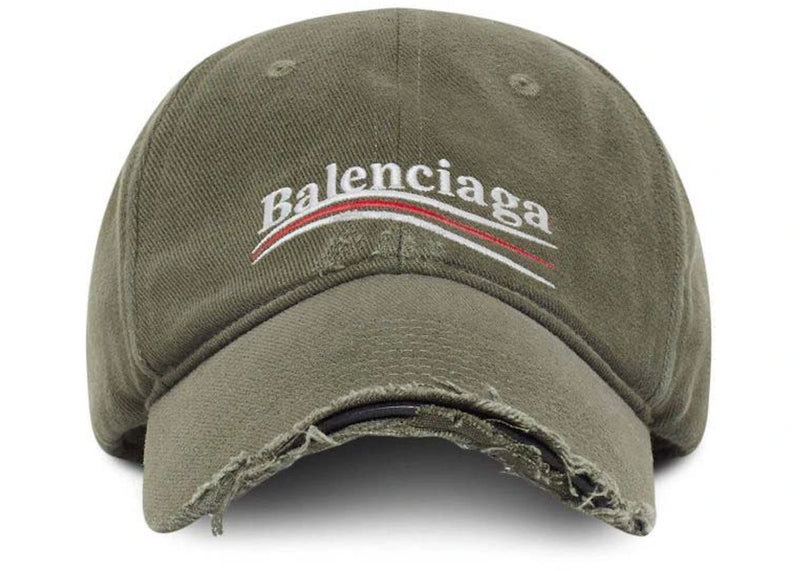 The Balenciaga Political Campaign Distressed Cap Khaki/Multi is now available at Side Kicks!