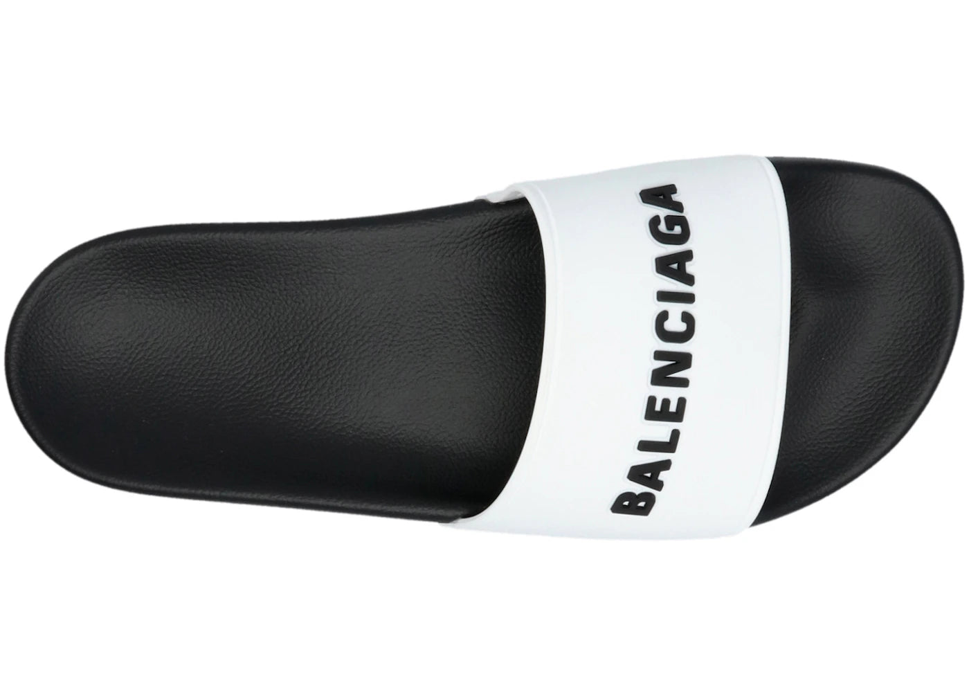 The Balenciaga Pool Slides Logo White Black (Women's) is now available at Side Kicks!