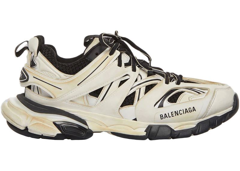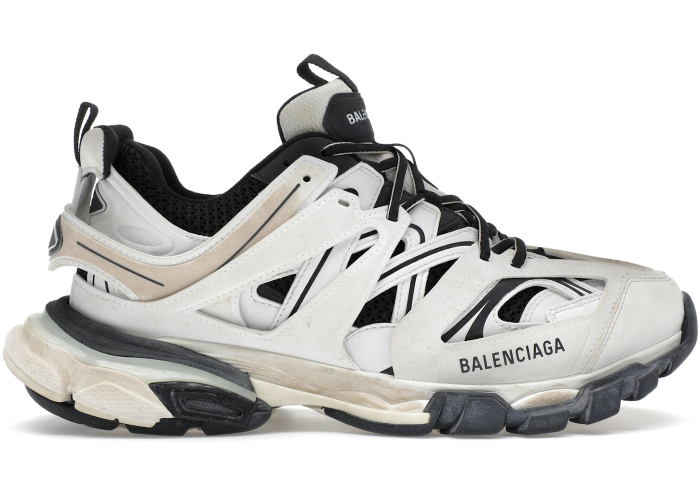 The Balenciaga Track White features a white mesh upper with grey and black synthetic overlays. Its chunky rubber sole has a unique tread pattern for enhanced traction. The design includes...