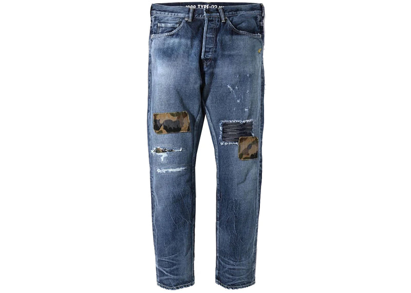The BAPE 1999 Type-02 1st Camo Patch Damaged Denim Pants Indigo is now available at Side Kicks!