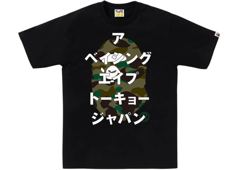 The BAPE 1st Camo Bape Katakana Tee Black/Green is now available at Side Kicks!