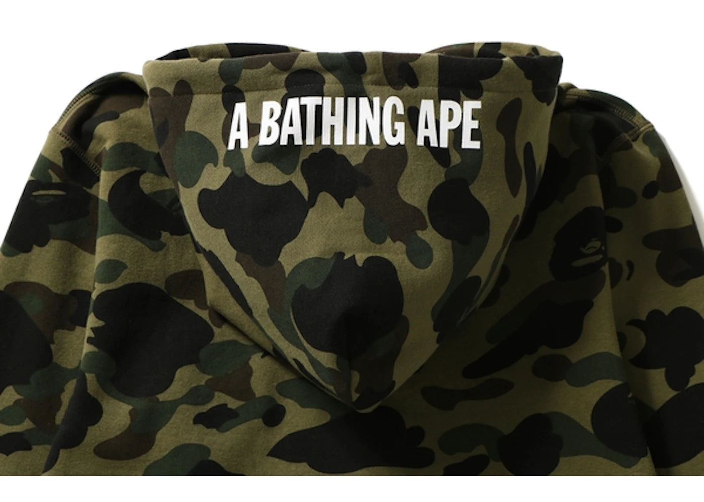The BAPE 1st Camo College Pullover Hoodie Green is now available at Side Kicks!