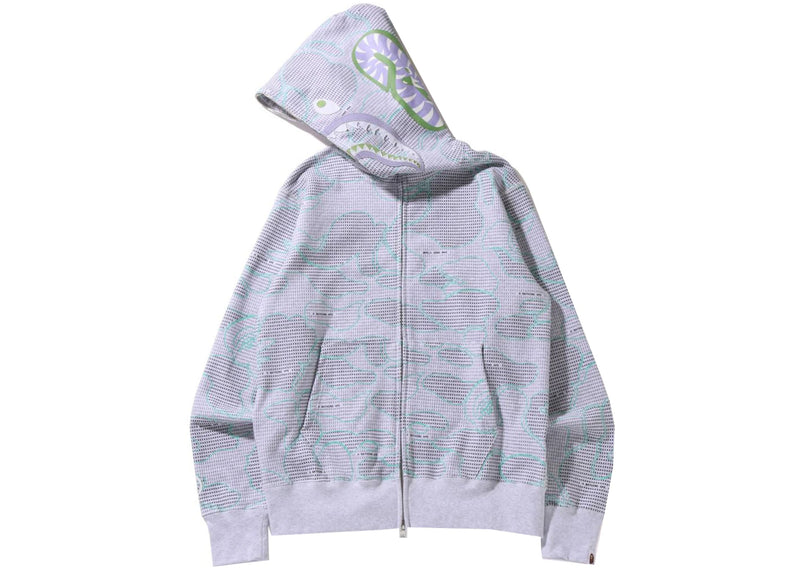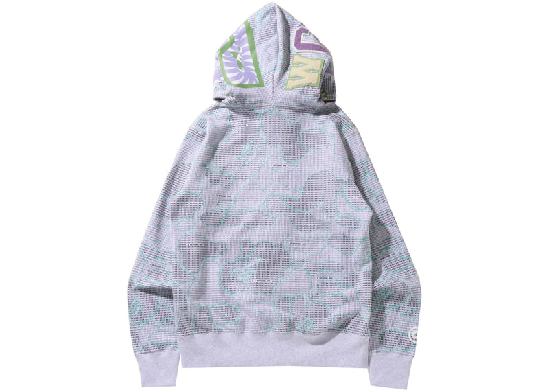 The BAPE Text Code Camo Shark Full Zip Hoodie Gray is now available at Side Kicks!