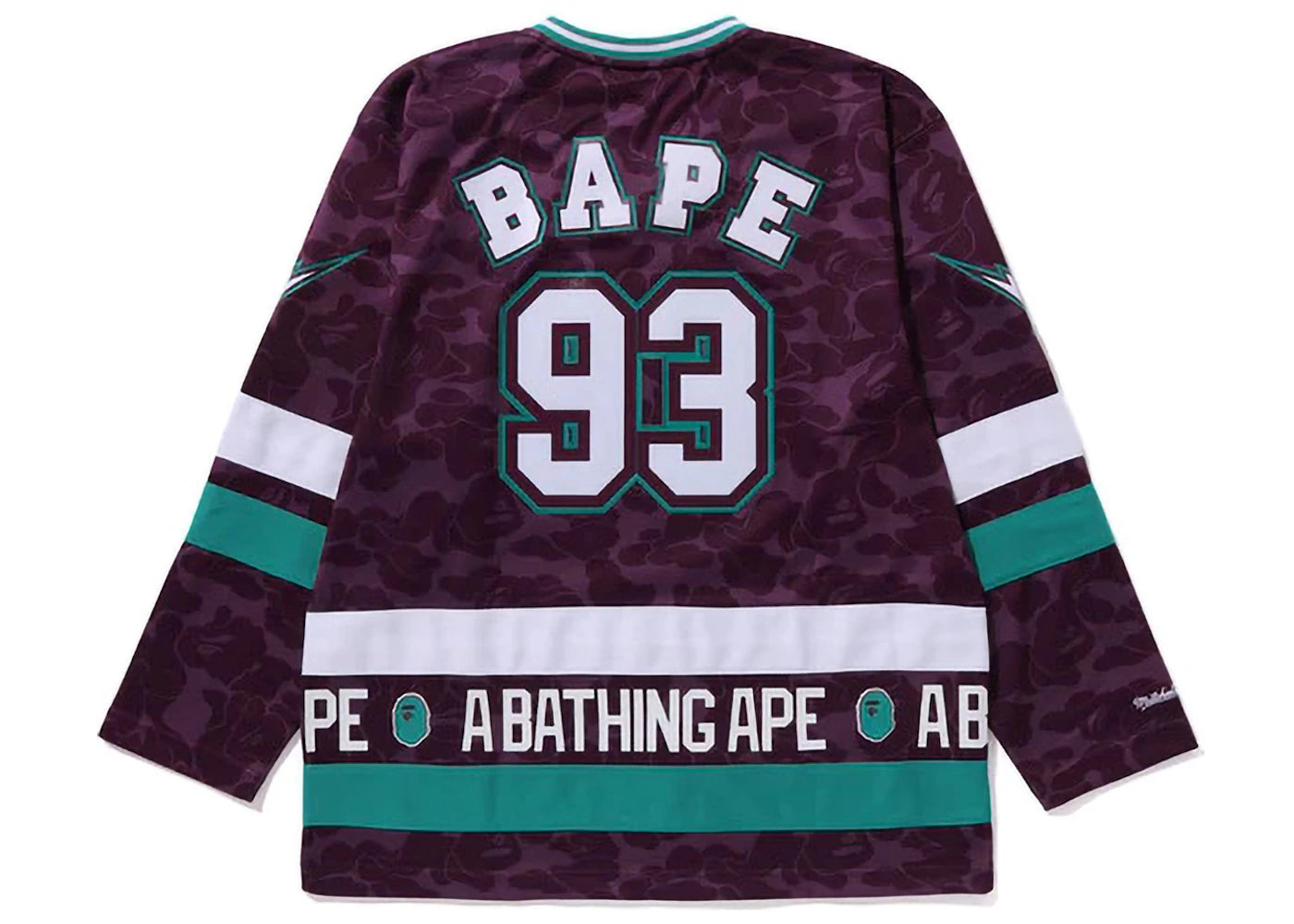 The BAPE x Mitchell & Ness NHL Anaheim Ducks Mesh Hockey Jersey L/S Tee Purple is now available at Side Kicks!...