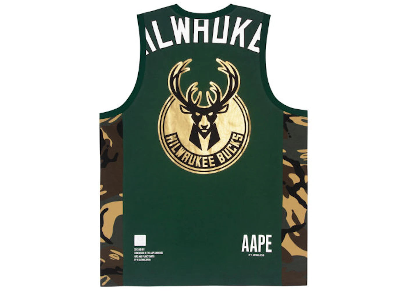 BAPE x NBA Style Ape Face Milwaukee Bucks Basketball Tank Top Army Camo