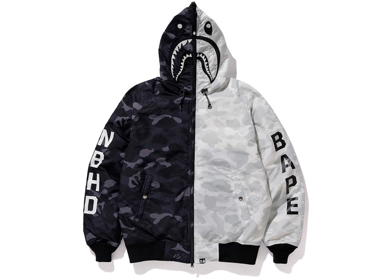 The BAPE x Neighborhood Down Shark Jacket Black/White is now available at Side Kicks!