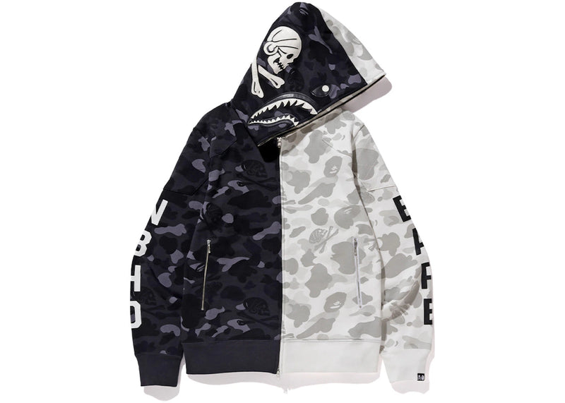 The BAPE x Neighborhood Split Camo Shark Full Zip Hoodie Black/White is now available at Side Kicks!