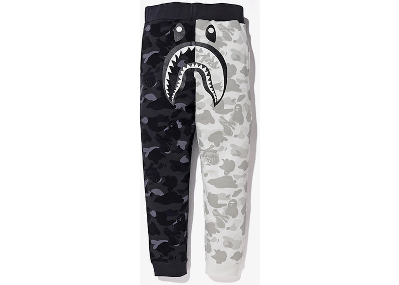 The BAPE x Neighborhood Split Camo Shark Sweatpants Black/White is now available at Side Kicks!