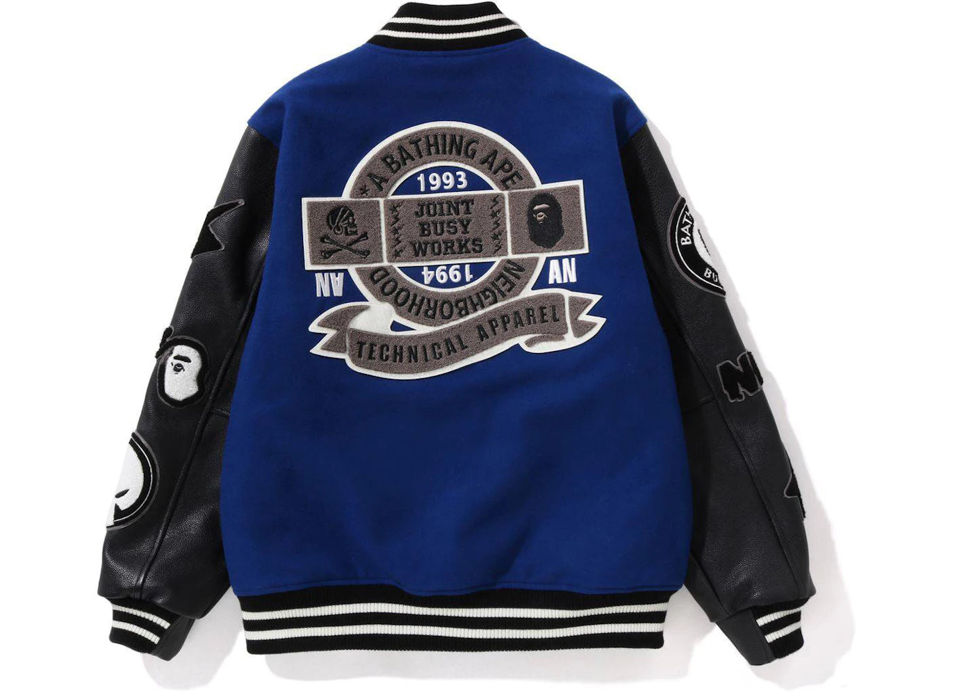 The BAPE x Neighborhood Varsity Jacket Blue Black is now available at Side Kicks!