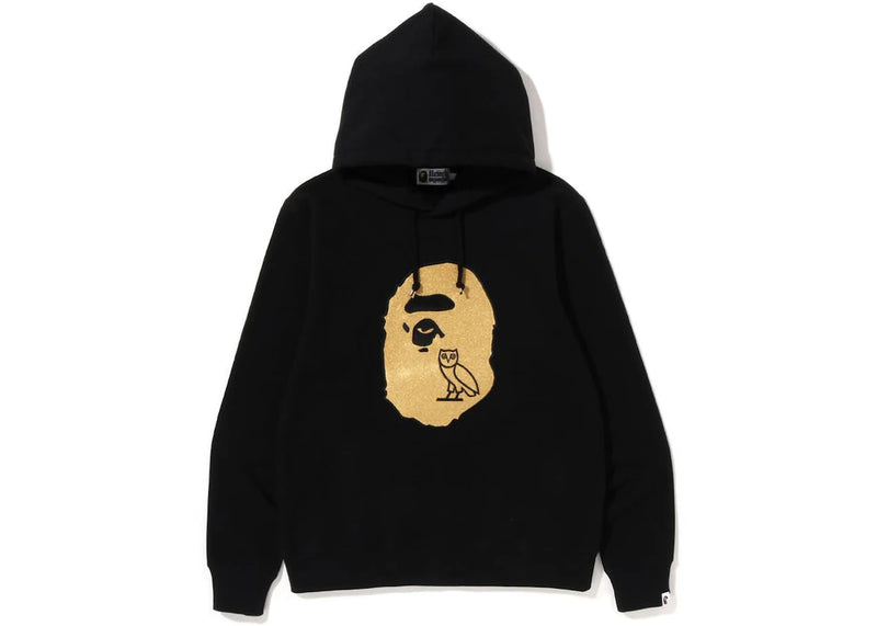 The BAPE x OVO Ape Head Pullover Hoodie Black Gold is now available at Side Kicks!