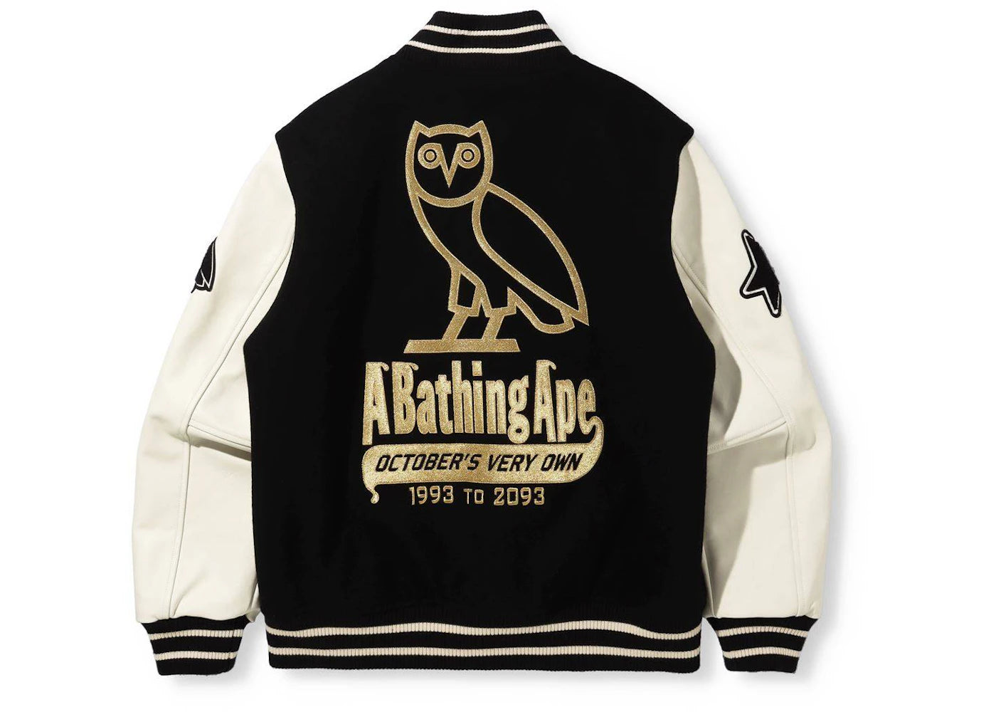 The BAPE x OVO Varsity Jacket Black is now available at Side Kicks!