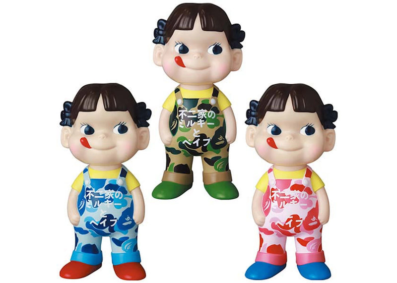 The BAPE x Peko-chan Fujiya Soft Vinyl Collection Green/Pink/Blue is now available at Side Kicks!