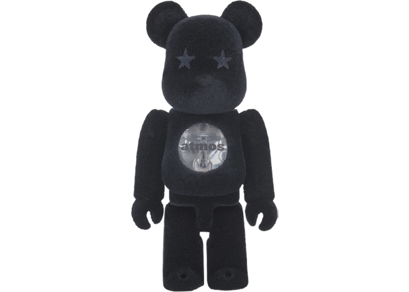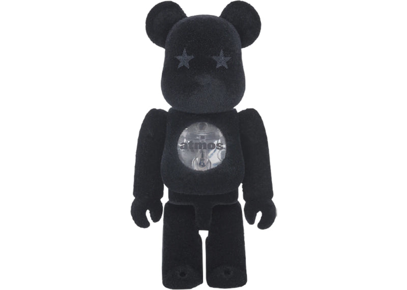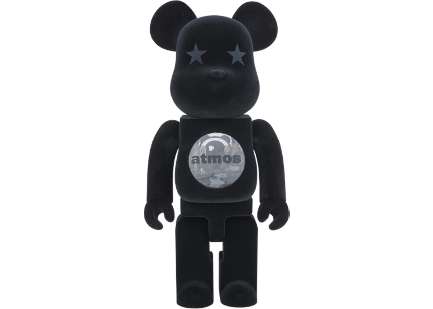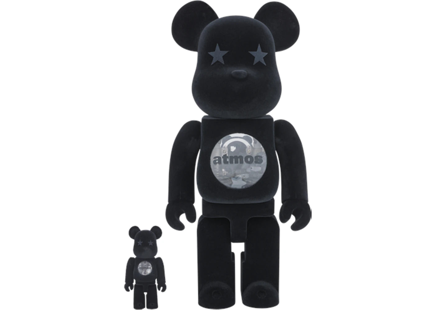 The Bearbrick x atmos x Staple #2 100% & 400% Set in black/green features an asymmetrical design with one side in vibrant camo and atmos branding, while the other side...