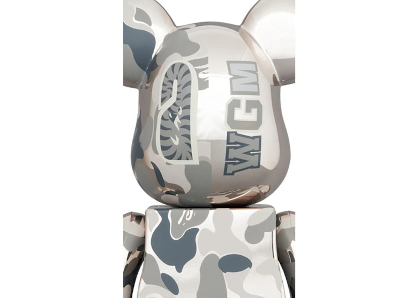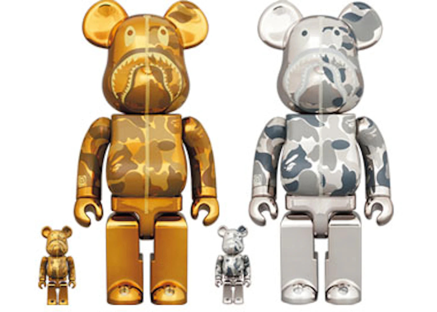 The Bearbrick x BAPE Camo Shark 100% & 400% 4-Pc Set Gold/Silver is now available at Side Kicks!
