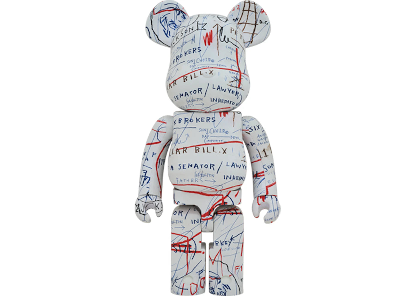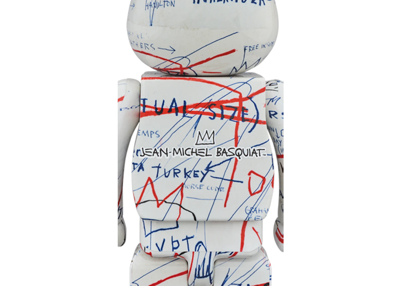 The Jean-Michel Basquiat 1000% Bearbrick features the artist’s 1982 painting ‘Untitled (Jackson)’ across its white base, with blue, black, and red text and drawings. The packaging displays matching artwork. Released...