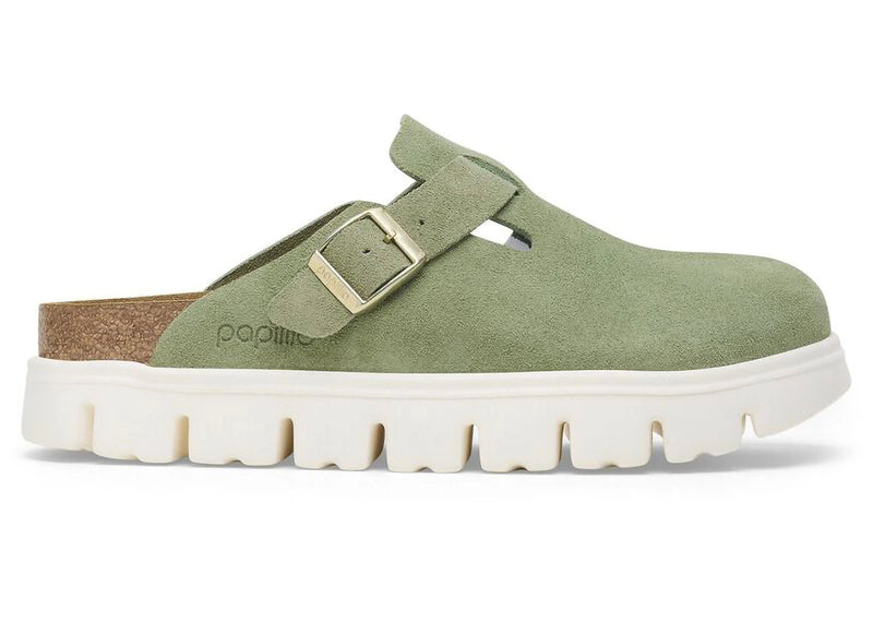 The Birkenstock Boston Chunky Suede Green Tea (Narrow) (Women's) is now available at Side Kicks!