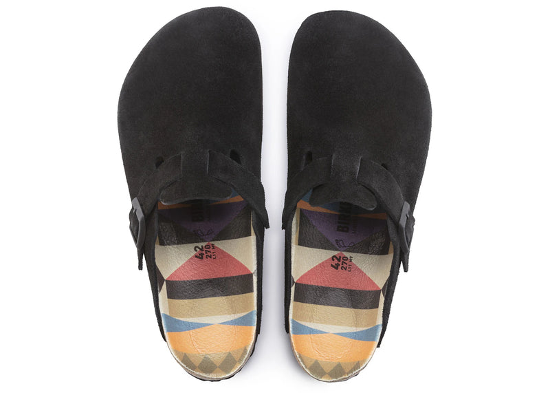 The Birkenstock Boston Suede Black Pattern Footbed is now available at Side Kicks!