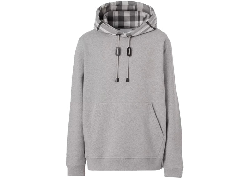 The Burberry Check Hood Cotton Hoodie Pale Grey Melange is now available at Side Kicks!