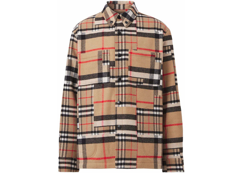 The Burberry Check-Pattern Patchwork Wool Oversized Overshirt Beige is now available at Side Kicks!