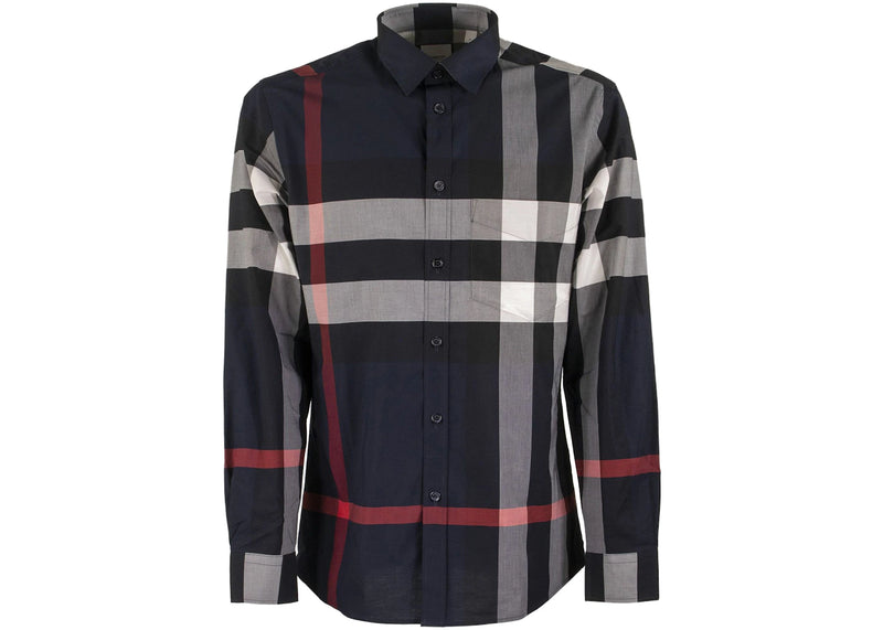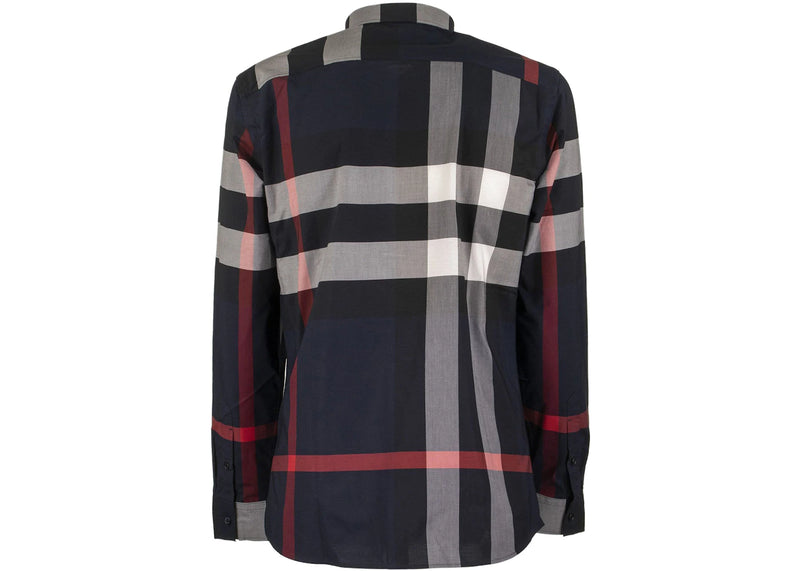 The Burberry Check Stretch Cotton Poplin Shirt Navy is now available at Side Kicks!