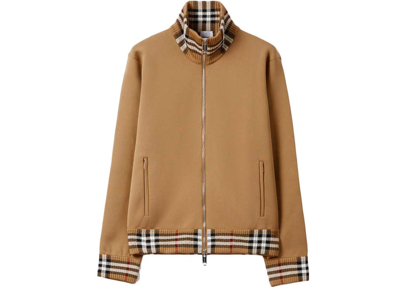 The Burberry Check Trim Viscose Blend Track Jacket Camel is now available at Side Kicks!