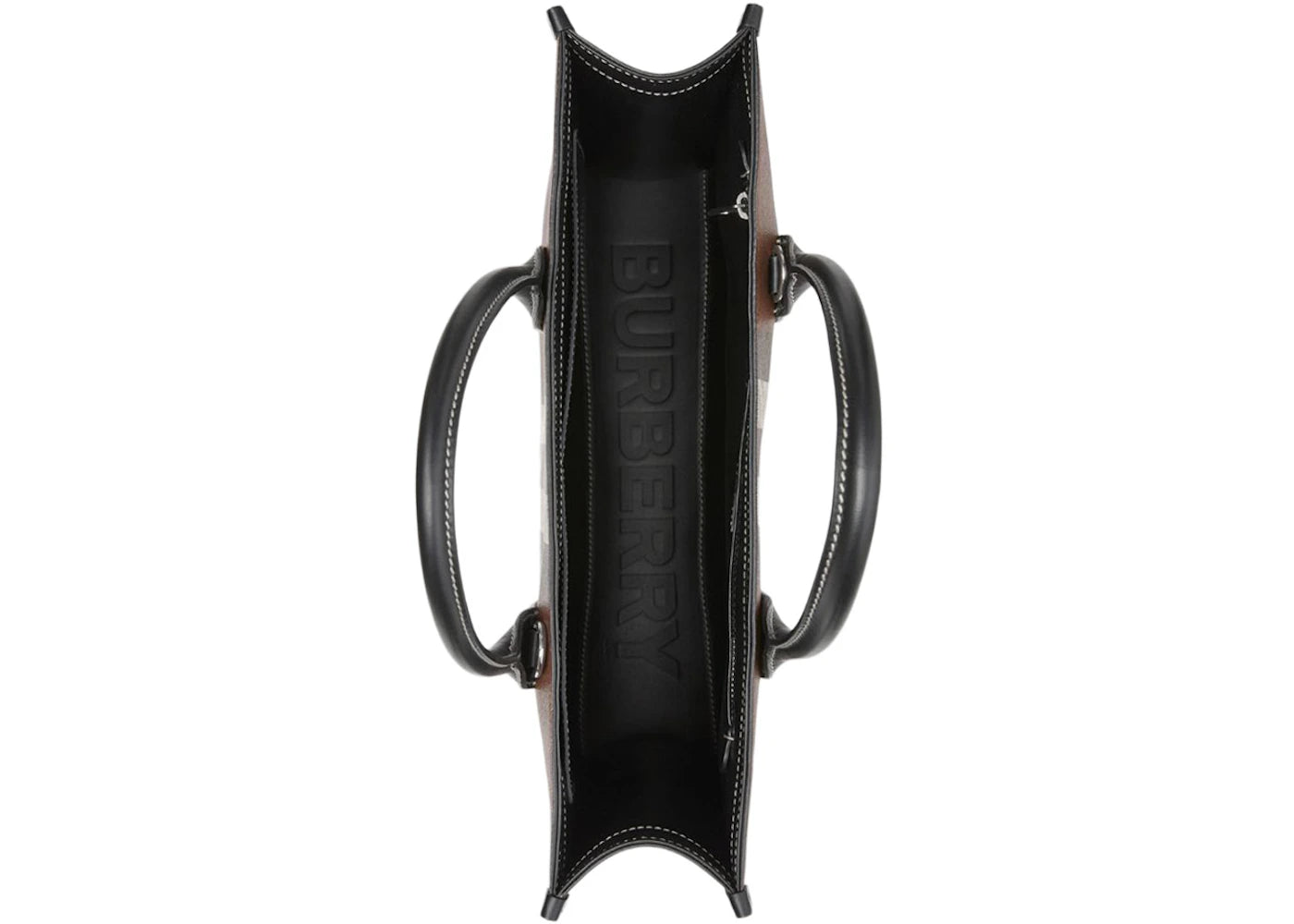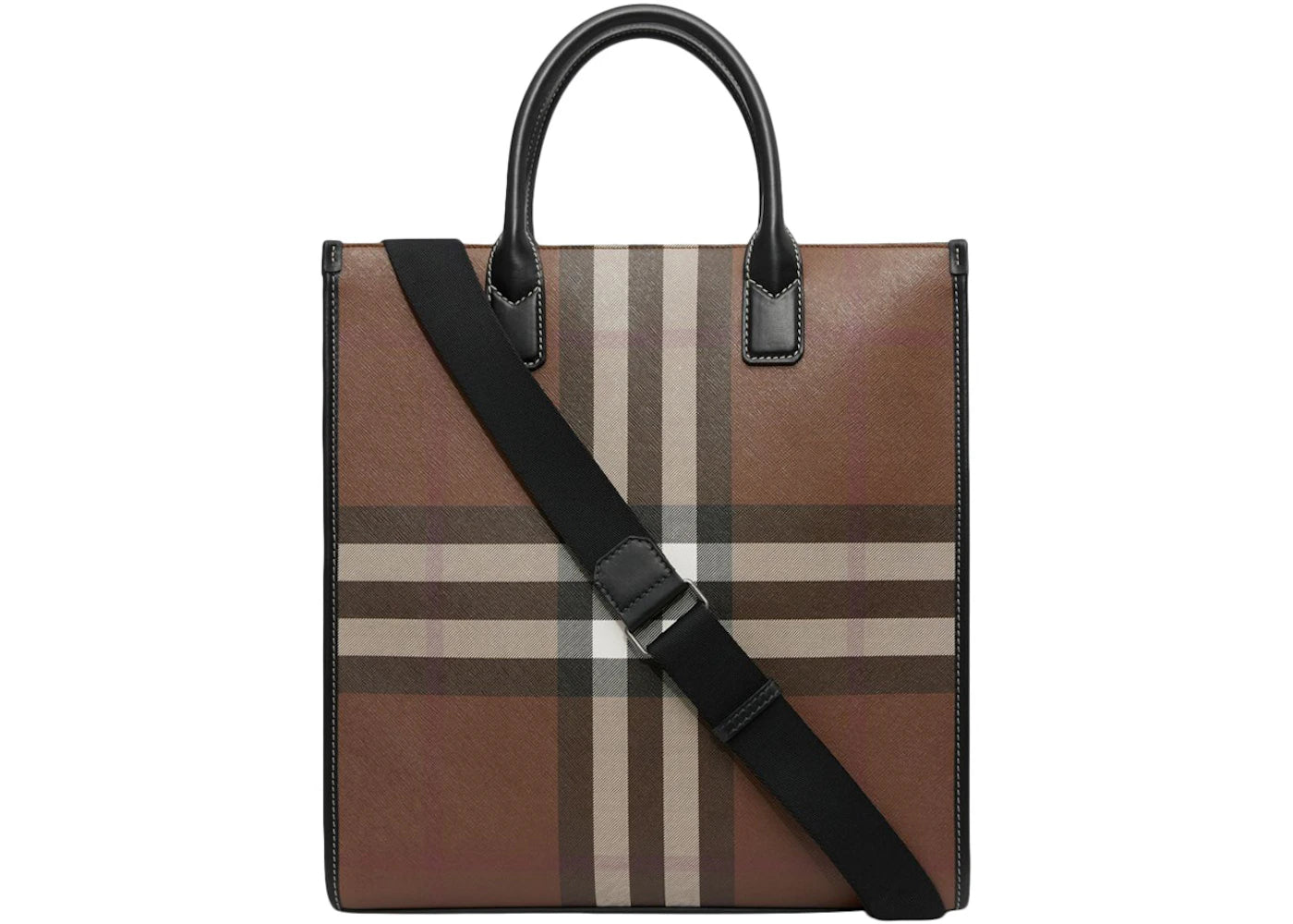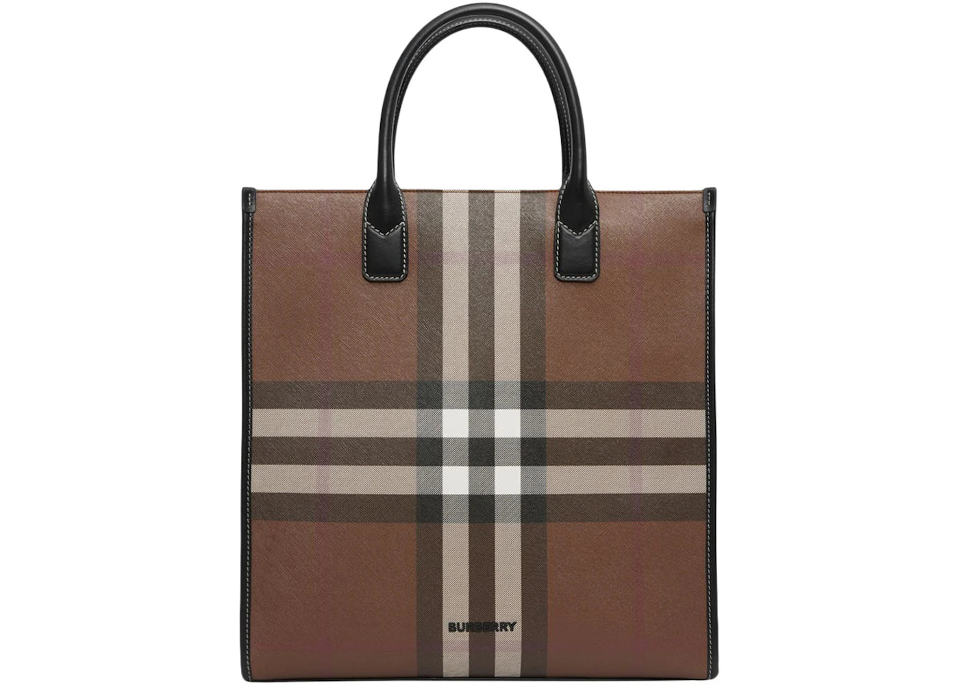 The Burberry Exaggerated Check Slim Vertical Denny Tote Dark Birch Brown/Black is now available at Side Kicks!