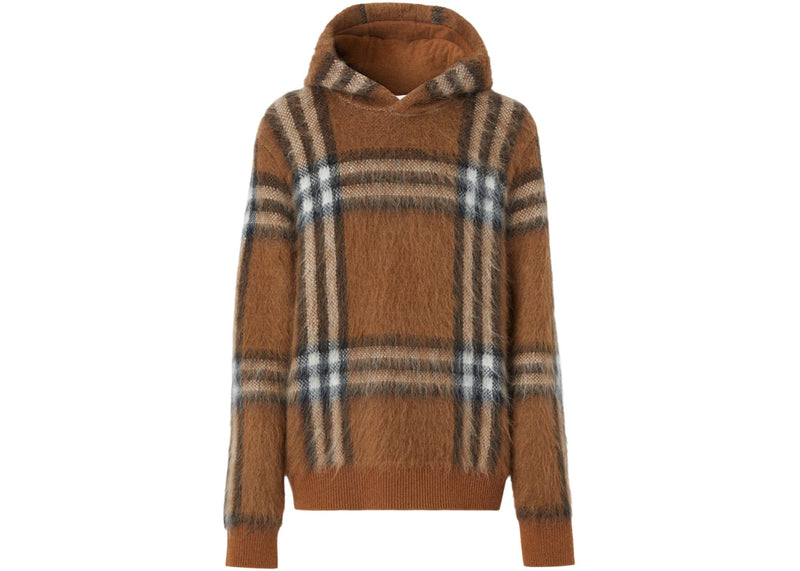 The Burberry Exaggerated Check Wool Mohair Blend Hoodie Dark Birch Brown is now available at Side Kicks!