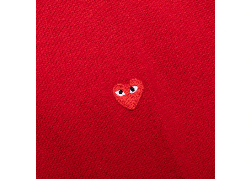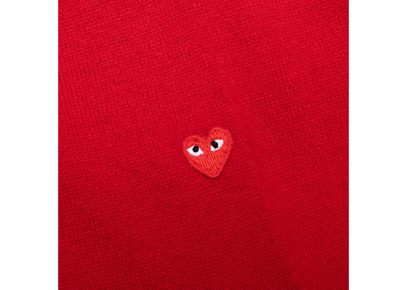 The Comme des Garcons Play Small Heart on Sleeve V Neck Sweater Red is now available at Side Kicks!