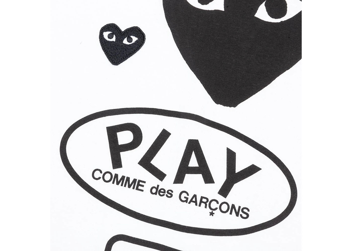 The Comme des Garcons Play Women's Black Multi Logo L/S T-shirt White is now available at Side Kicks!