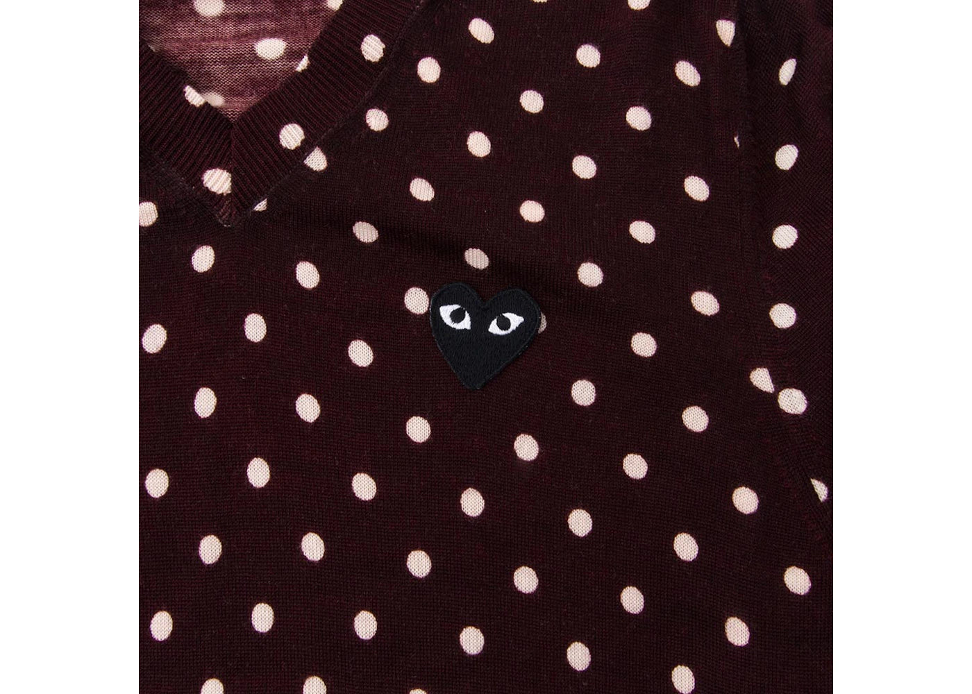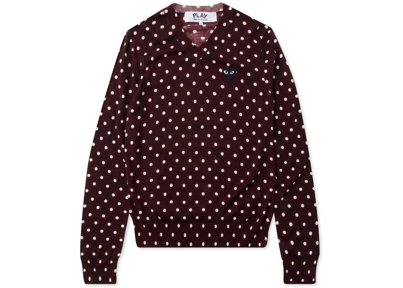 The Comme des Garcons Play Women's Polka Dot V Neck Sweater Burgundy is now available at Side Kicks!