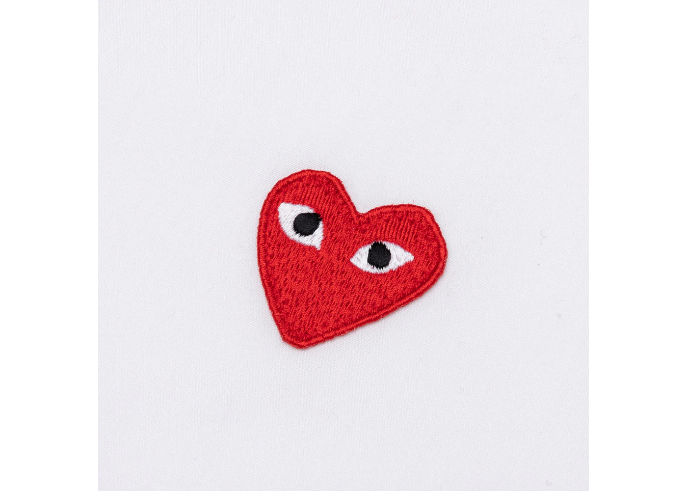 The Comme des Garcons Play Women's Red Emblem Button Up Shirt White is now available at Side Kicks!