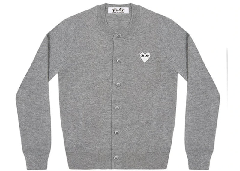 The Comme des Garcons Play Women's White Heart Knit Cardigan Sweater Light Grey is now available at Side Kicks!