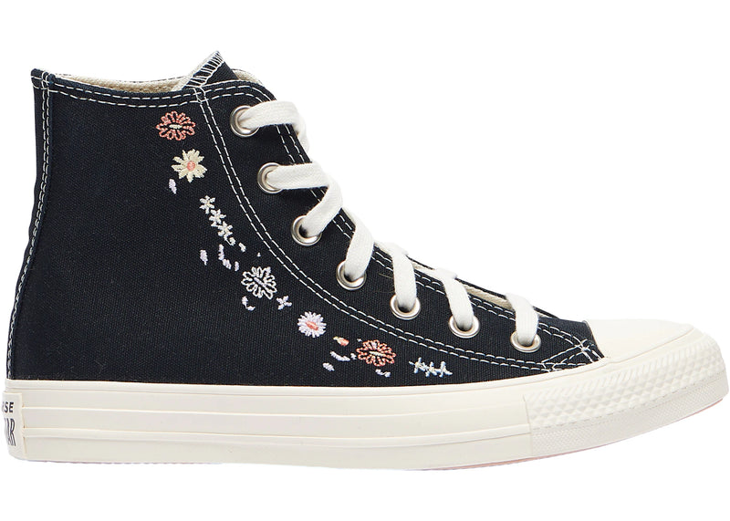 The Converse Chuck Taylor All Star Hi Embroidered Floral (Women's) features a black canvas upper with white stitching and floral embroidery on both sides. It includes metallic eyelets, white laces,...