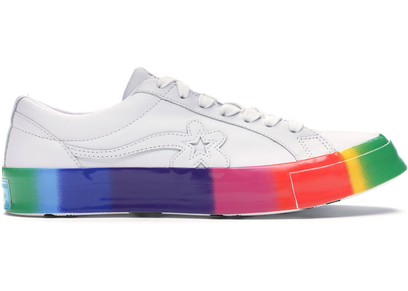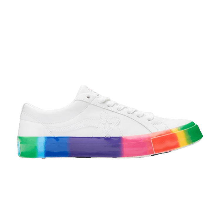 The Converse One Star Ox Golf Le Fleur Rainbow Sole features a white leather upper with a vibrant rainbow-colored midsole and rubber foxing. It includes a white rubber outsole with black prints and a patterned tread for traction. The shoe is reinforced for durability and equipped with OrthoLite insoles for comfort. Released on June 28, 2019, the Converse One Star Ox Golf Le Fleur Rainbow Sole is available now at Side Kicks.