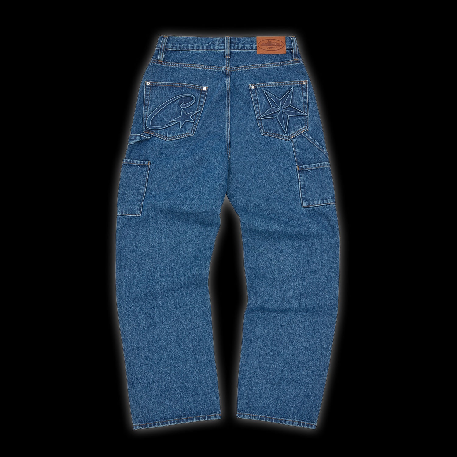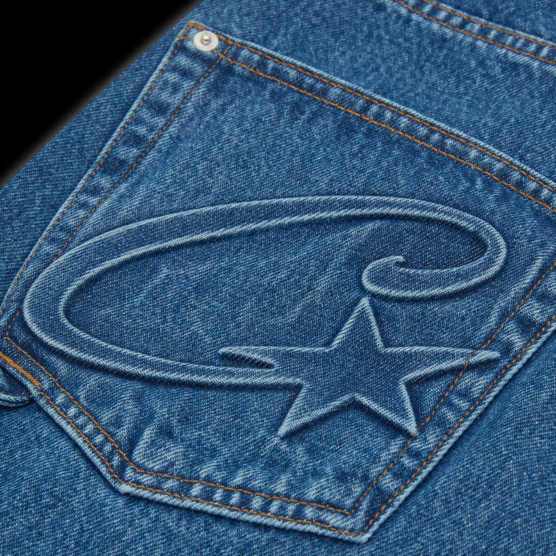 The Corteiz Embossed C-star Denim Work Pant - blue is now available at Side Kicks!