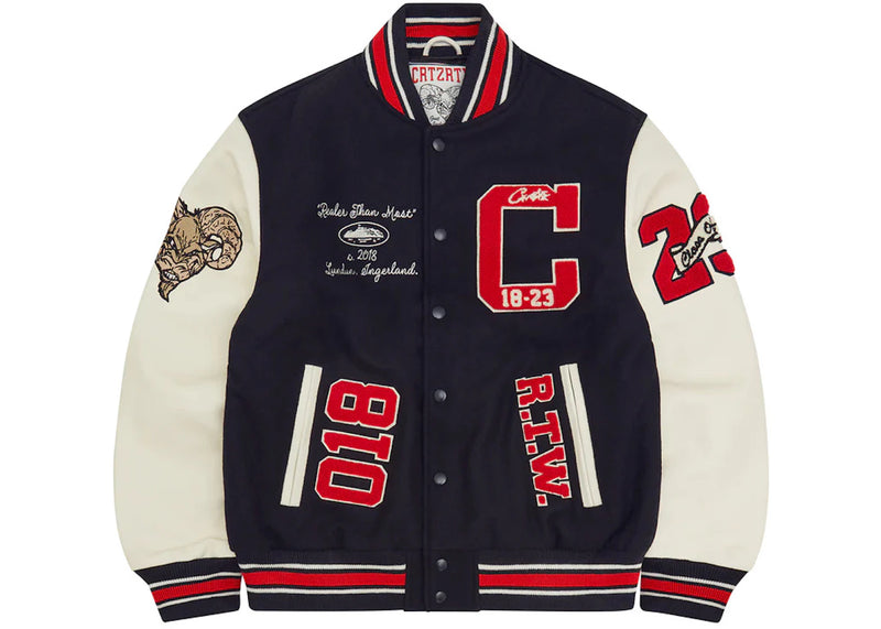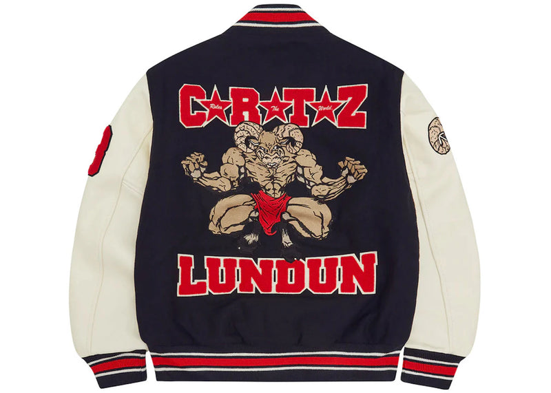 The Corteiz Goat Varsity Jacket Navy is now available at Side Kicks!