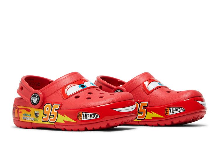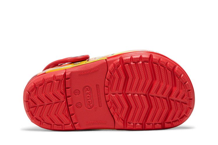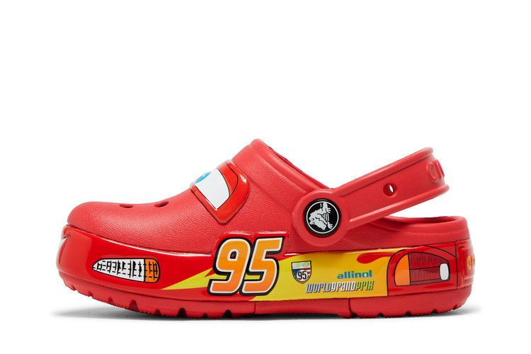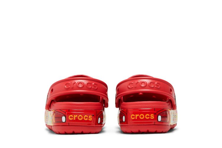 The Crocs Classic Clog Lightning McQueen (TD) features a race car-inspired design with LED lights that flash while walking. Made from lightweight foam resin, it includes details like eyes, headlights, and decals resembling the animated car. The pivoting heel strap allows for clog or slide-style wear, and Jibbitz charms can be added for customization.